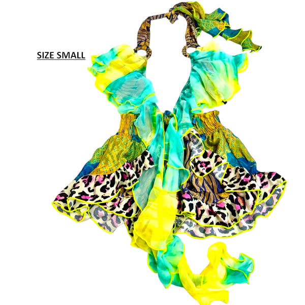 Playsuit with halter bodice (with back tie) and shorts attached at front (only). Bodice has generous overlay frill that ends in a long tie where bodice meets shorts. Shorts have shirred waistband, frills around legs, and front (frilled) overlay detail.