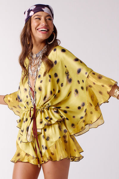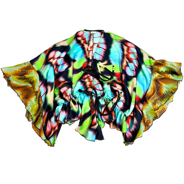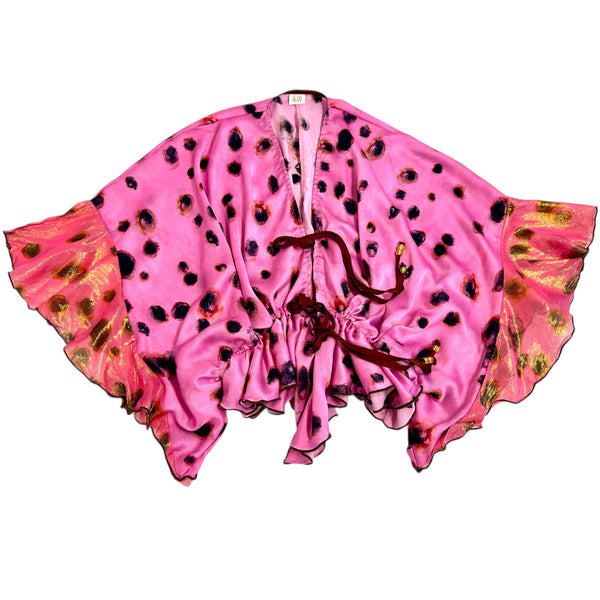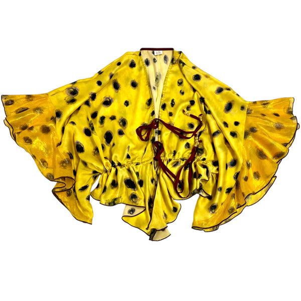 Front opening top with drawstring at waist and peplum detail in front. Additional (optional) front tie at cleavage. The sleeves are boxed with contrast frill detail at sleeve ends.