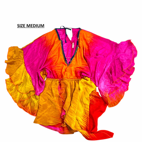 Playsuit with trimmed, plunging front neckline, and heart-shaped ring detail in the V. It ties behind the neck and has loose, boxy sleeves with sleeve-end soft frill detail. The waist is elasticated. The shorts have an asymmetrical overlay in front