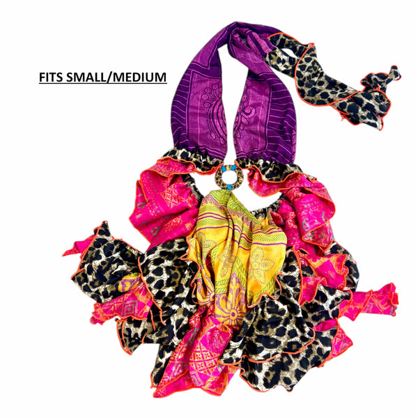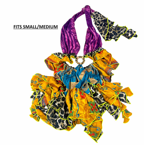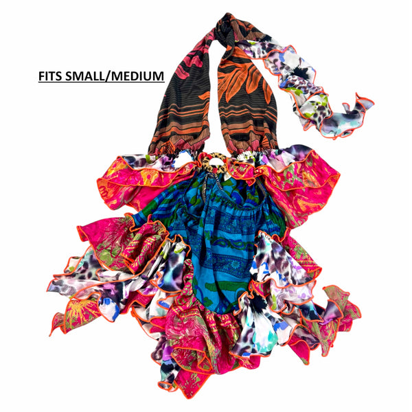 Halter neckline with 2 bodice panels that are joined by a ring centre front. The waist of the bodice is elasticated, with a shaped double frill. The skirt is short and flouncy with an irregular frilled hemline, and an elasticated waist that only attaches to bodice at centre front ring, and centre back waist frill of bodice. The skirt waist dips on the sides.