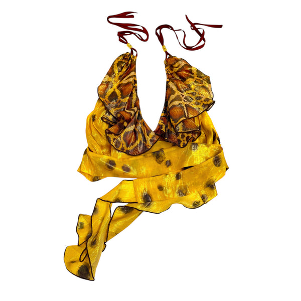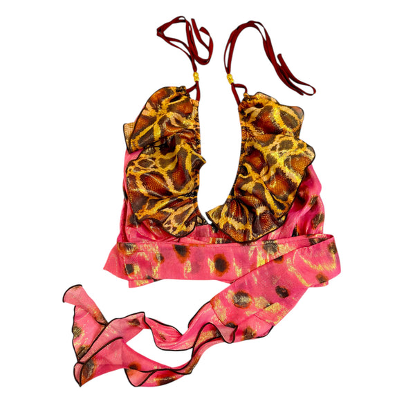 Halter neck crop top with contrast ruffle detail at V-front neckline, bare back, and sash tie