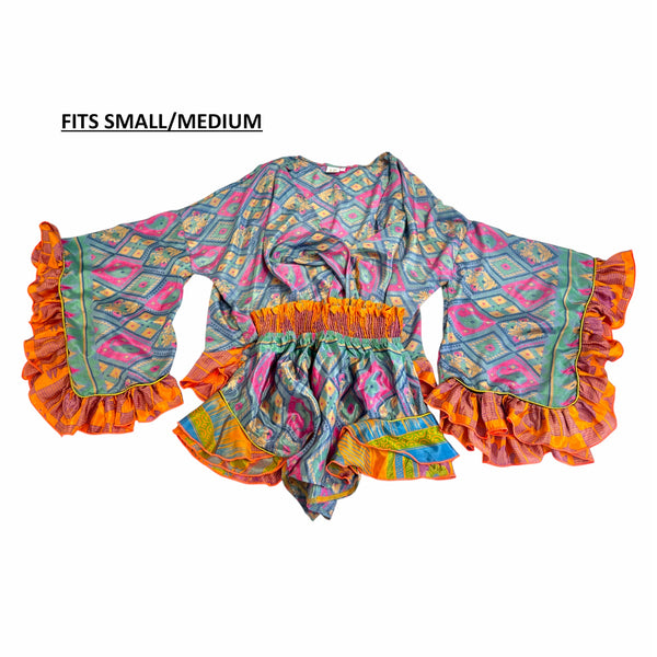 Set consisting of a cropped top and shorts. The top has a cross/wrap over front and kimono styled sleeves with a gold piped frill. The shorts are shirred at the waist, and have gold piped