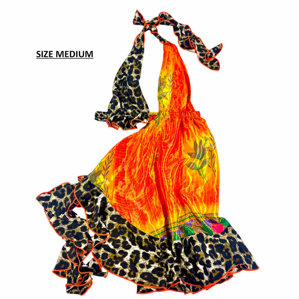 Mini dress with halter-neck bralette top and asymmetrical skirt. The skirt begins as an extension of the LHS top, falls diagonally across the body, and then ties on the RHS hip. The skirt is trimmed with a frill