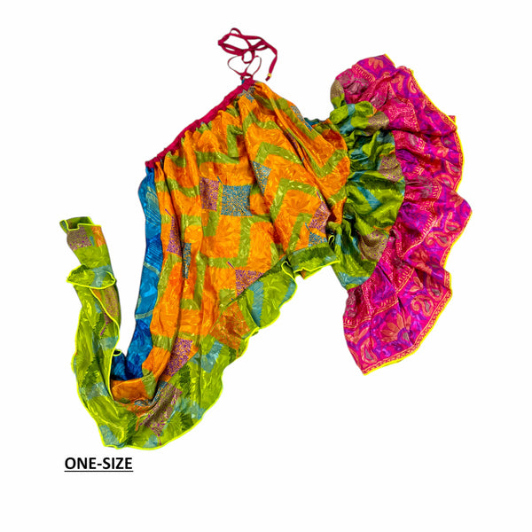 One-shouldered top with elasticated neckline that ties over the shoulder. The shoulder over which it ties has a bare shoulder below the tie, and a full sleeve with tiered frills. The waist is asymmetrical with the side opposite to the sleeve being longer