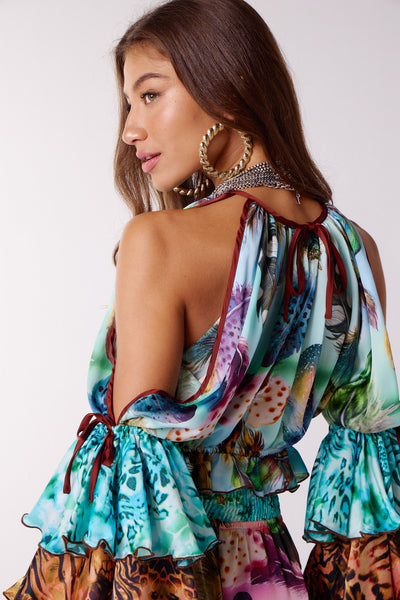 Crop top with high, gathered neckline (opening at back of neck) and elasticated hem. The sleeves are cut-away, showing bare shoulders, and have a tiered frill cuff in contrast fabrication.