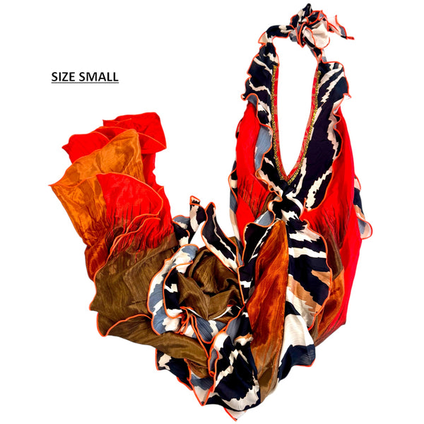 Maxi halter dress with trimmed, plunging neckline, and low elasticated back. The skirt has a high centre front opening with a short under ruffle/skirt. Frill detail starts at the neckline and continues down the front skirt split