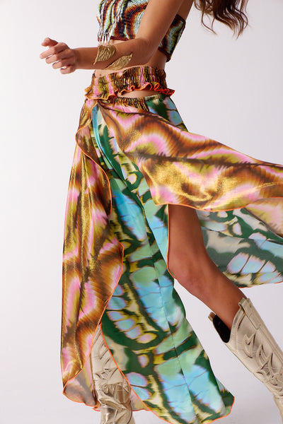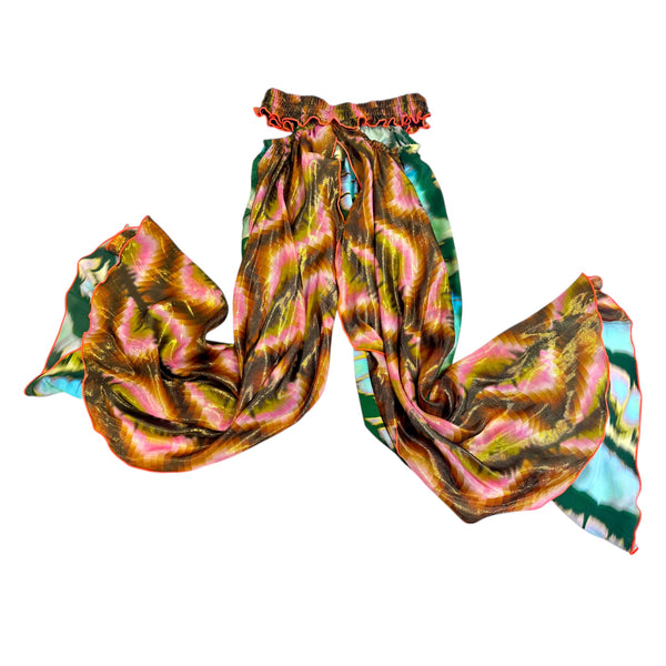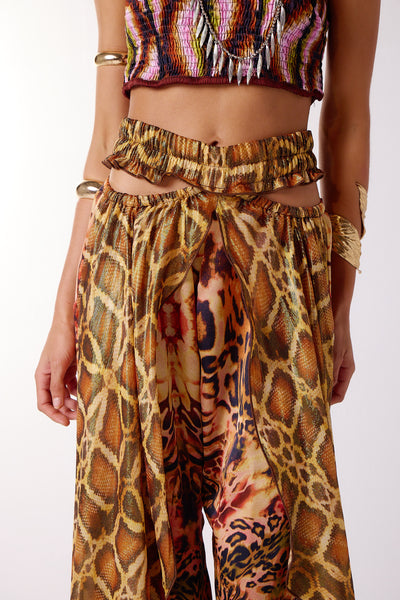Flowy pants with wide elastic waistband, cut outs on sides at waist, and front leg slits. There is contrast overlay detail on front legs.