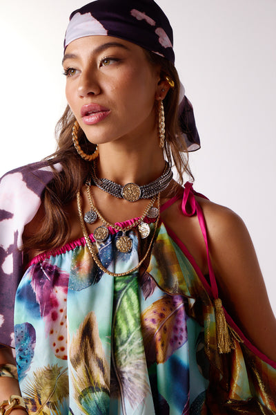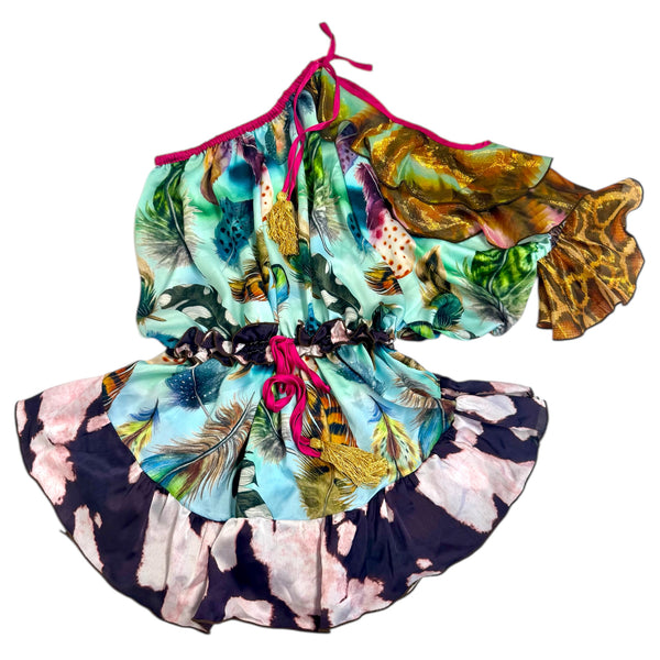 One-shouldered/sleeved mini dress with tie at shoulder. There is a frill/flounce around the bare-shoulder slit on the sleeve, and a frilled cuff at the wrist. The elasticated waist has a drawstring. Hand-crafted tassels on all ties. The hemline is shaped at the sides.