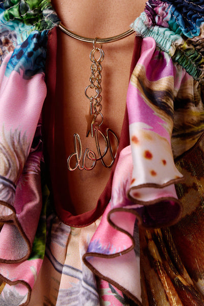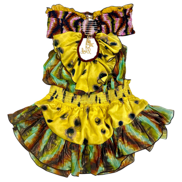 Mini dress with shirred boobtube top with centre front ring to which Doll charm jewelery is attached. The skirt has a shirred waist and is attached to the top with a centre front panel that has double frill detail.