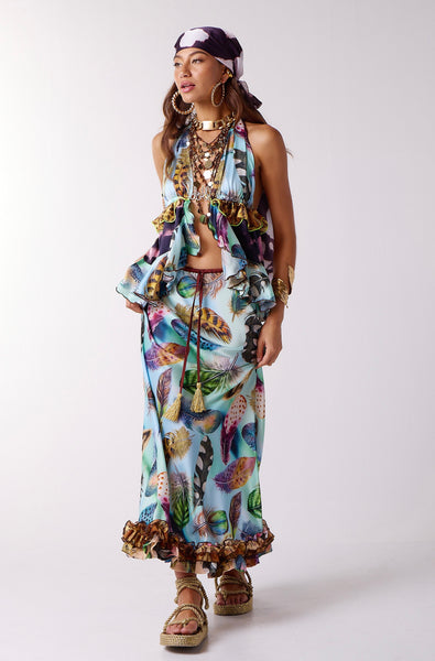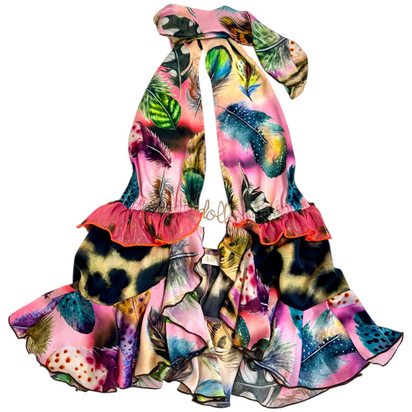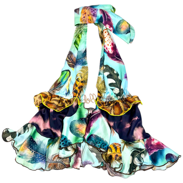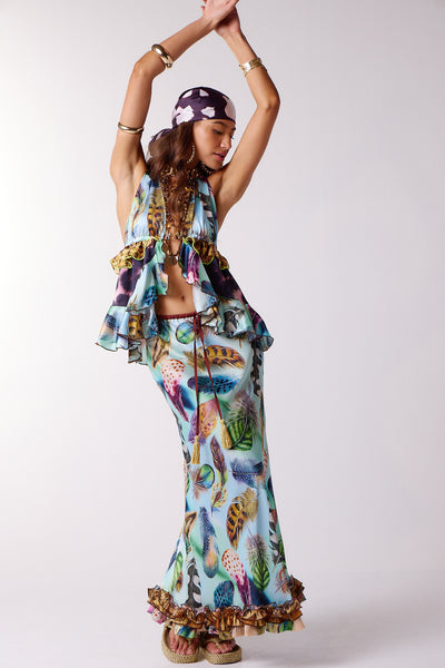 Halter Neck top with bralette front, and tiered/frilled peplum. Doll logo jewellery centre-front. Mostly bare back with low slung elasticated peplum (double frill detail) continuing from front, and tie (above peplum).