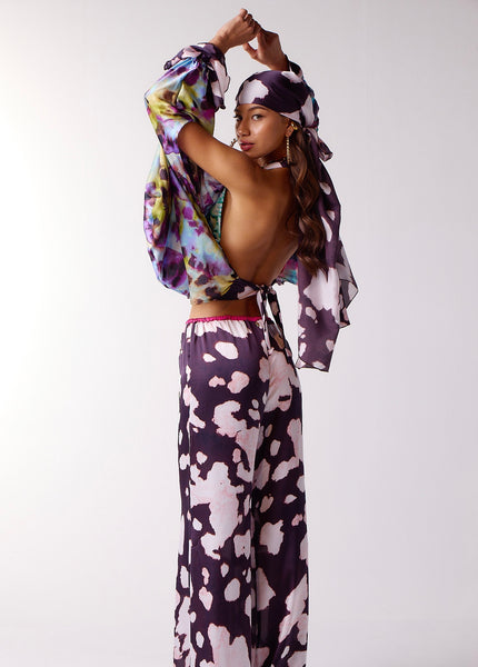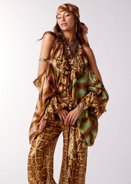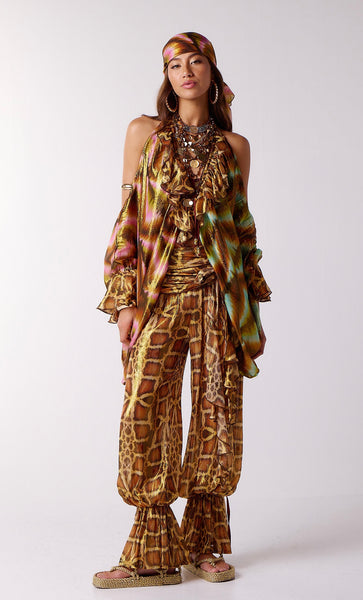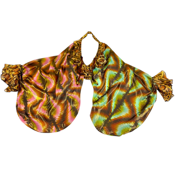 Halter bralette top with deep ruffled V-neckline with tie. Very full and flowy overlay body/sleeves flow from front neckline, leaving bare-shoulders. Sleeves have frilled wrist cuffs. Bare back with tie at waist back.
