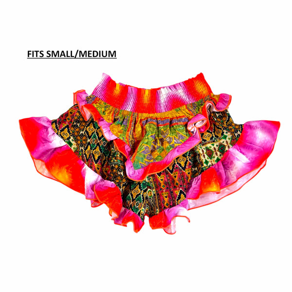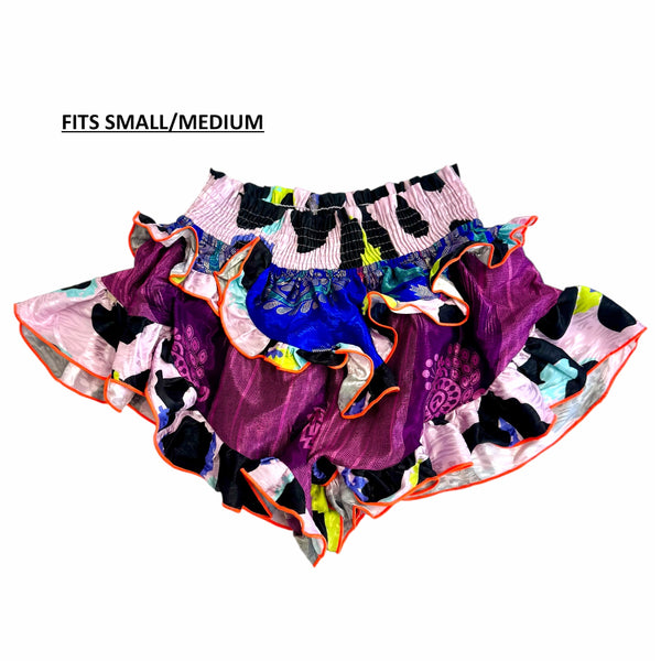Multi-panel shorts with broad shirred waistband. V-shaped frilled overlay, front and back, and leg frills.