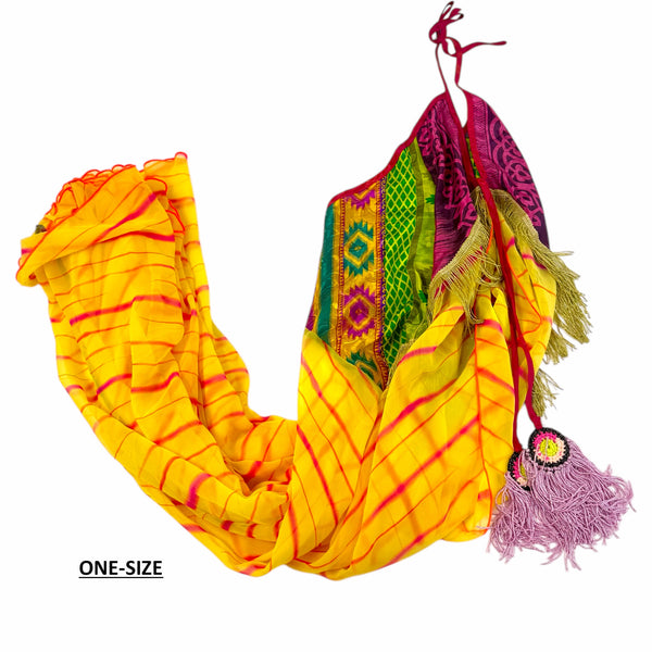 Halter neck with low back line and front opening. Fairly fitted bodice, and fuller skirt with side slits. Centre front ties with hand crochet tassel detail. Gold fringing detail at front where skirt meets bodice.