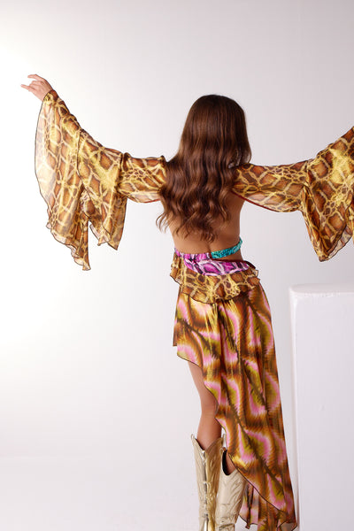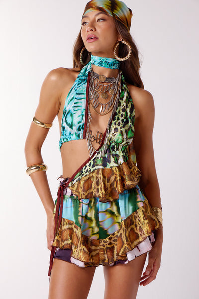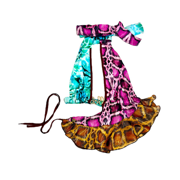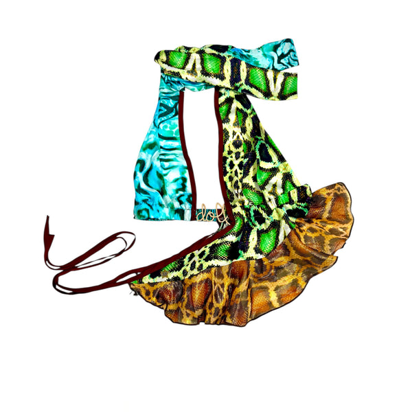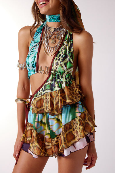Bralette-type halter with additional asymetrical waist panel that ties on side. Doll logo jewellery connects bralette centre-front.