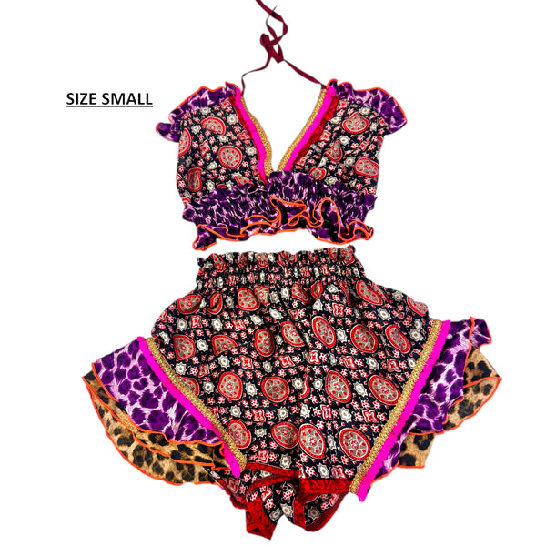 Set comprising full high waisted shorts with side detail, and cropped bralette top with elastication round hem and tie behind neck.